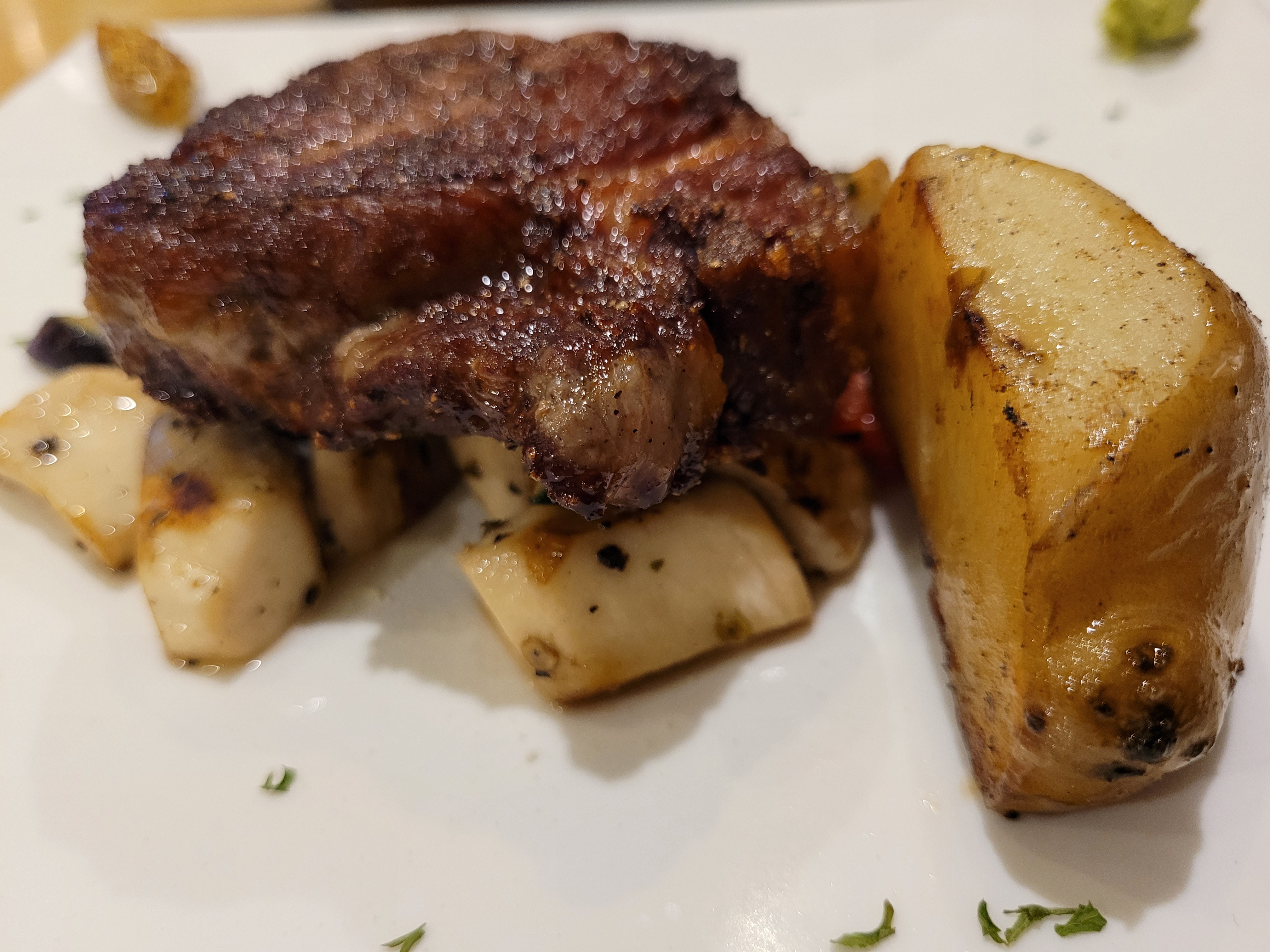 구운 야채위에 잘익은 고기가 올려져 있습니다.