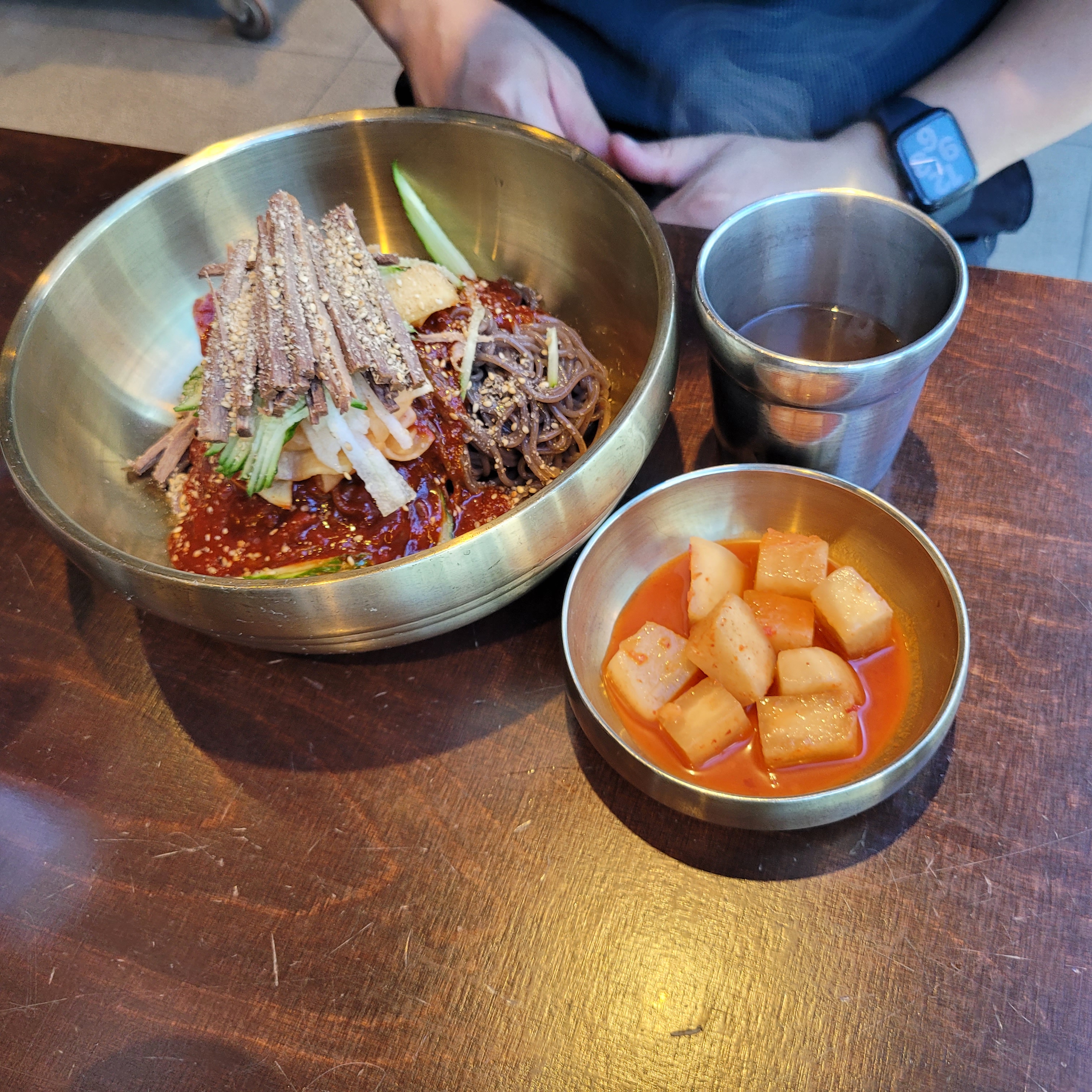 자리를 잡고 경성 비빔냉면과 돈까스를 시켰습니다